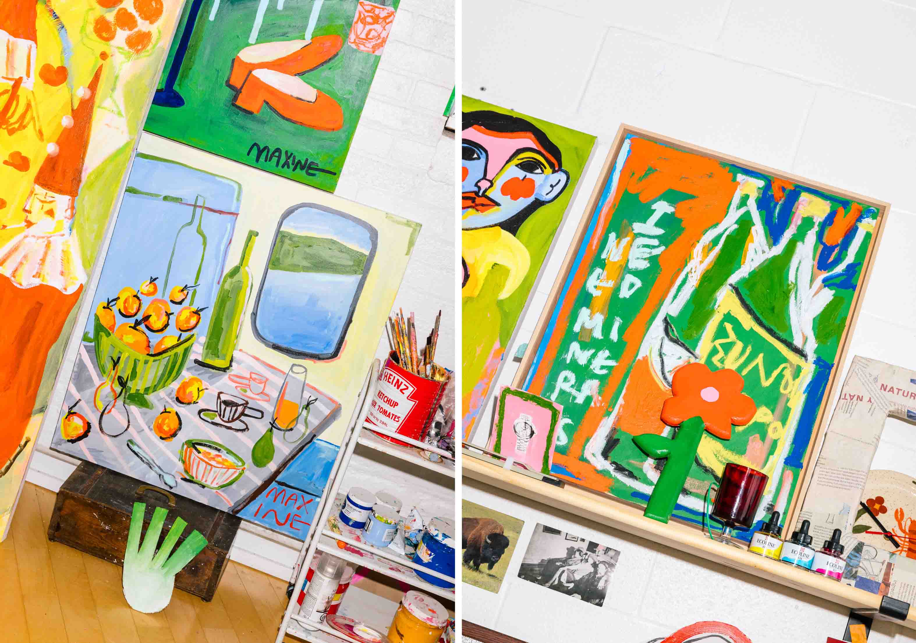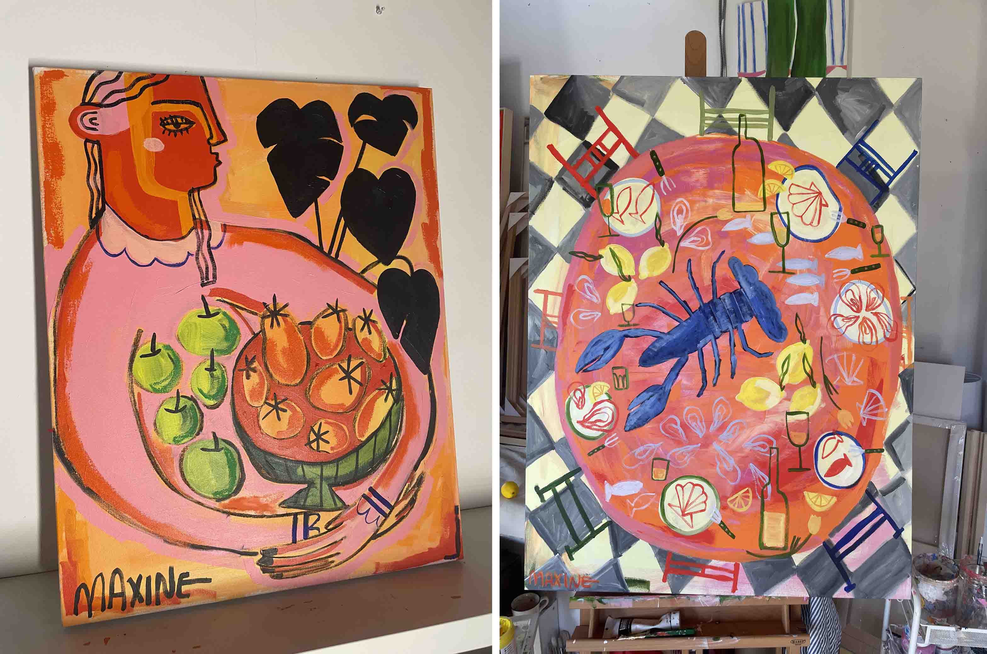 Known for her large-scale still-life paintings and multidisciplinary approach, MAXINE creates work that celebrates abundance, beauty, and the simple pleasures of everyday life. Her pieces often transform ordinary objects and fleeting moments into immersive visual narratives filled with movement, emotion, and character. Whether working with paint, drawing, or experimental materials, she approaches each medium with curiosity and fearlessness.