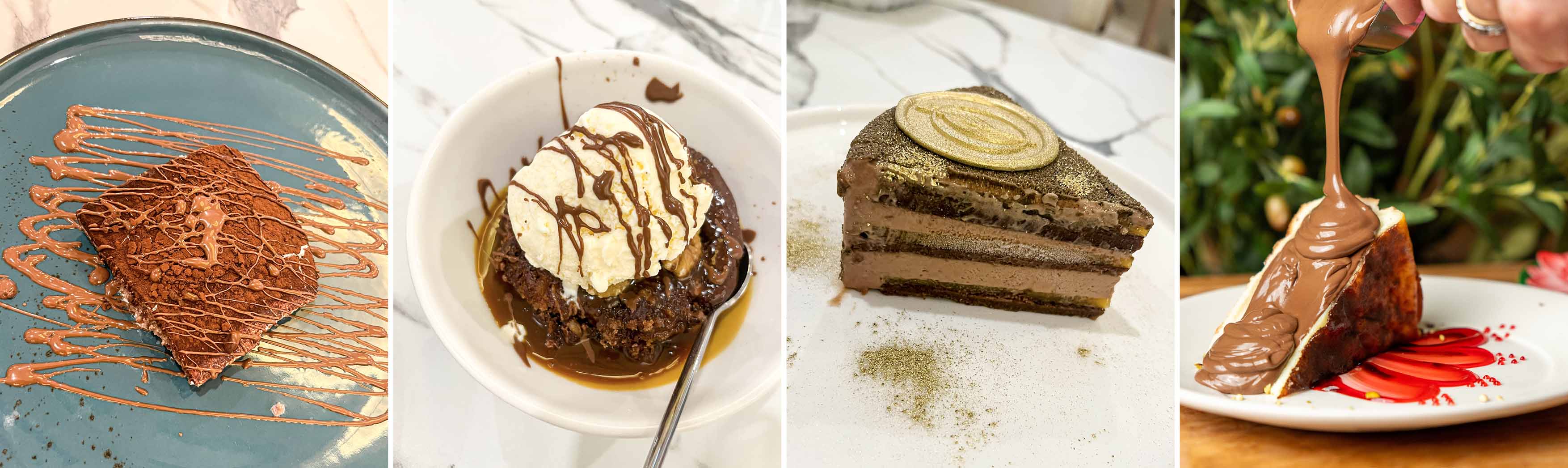 Just when we thought we couldn’t be more impressed, dessert was another spectacle. First came a fusion of tres leches cake and tiramisu, blending the milky softness of the former with the espresso-kissed richness of the latter. Light, creamy, and unexpected, it vanished in a flash. Next was a warm date cake with a scoop of ice cream – moist and rich with caramel-like sweetness, like a Middle Eastern twist on sticky toffee pudding, indulgent with the cool ice cream alongside. Finally came the showstopper: a chocolate cake dusted in edible gold, composed of thin layers of delicate sponge and smooth chocolate mousse with a hint of orange zest. Decadent yet light, it was an indulgence we kept dreaming about days later.