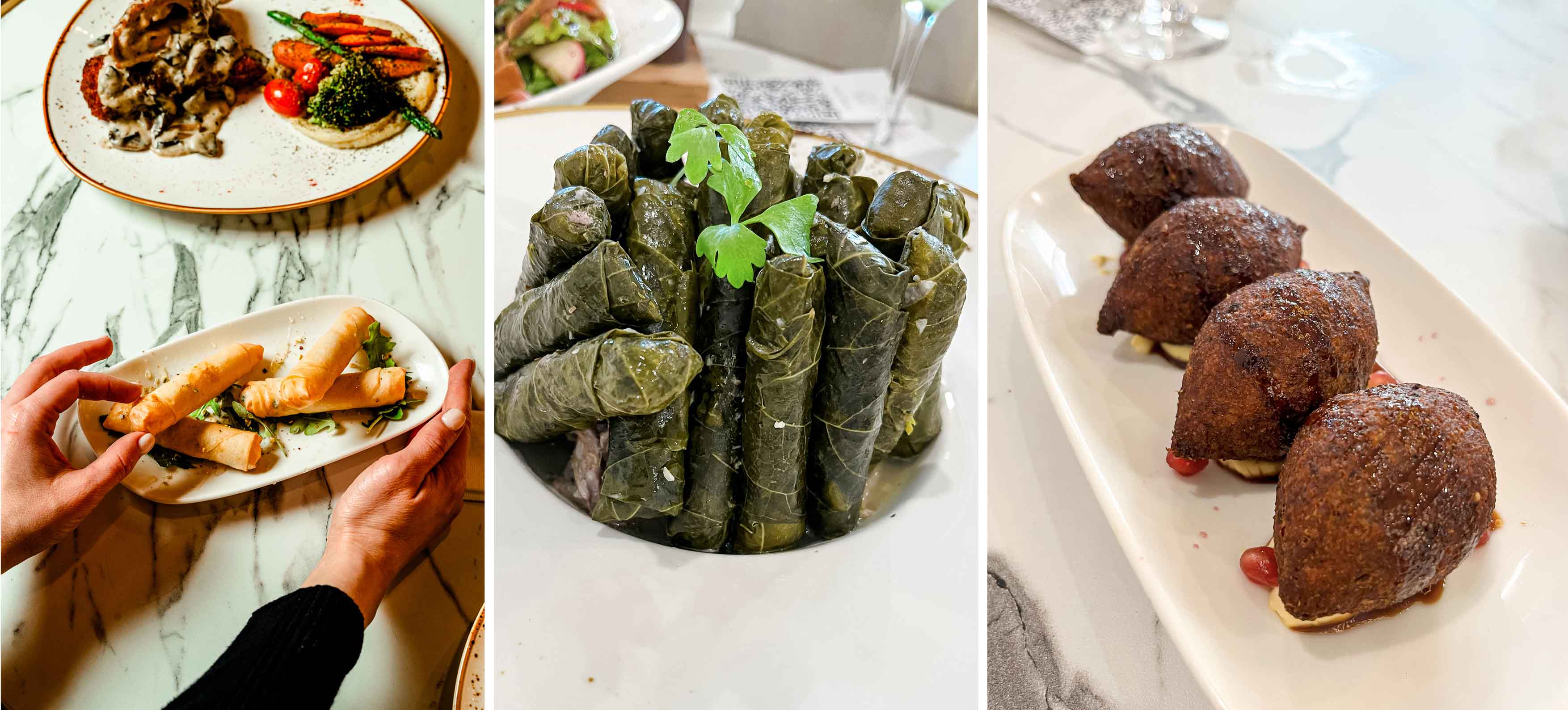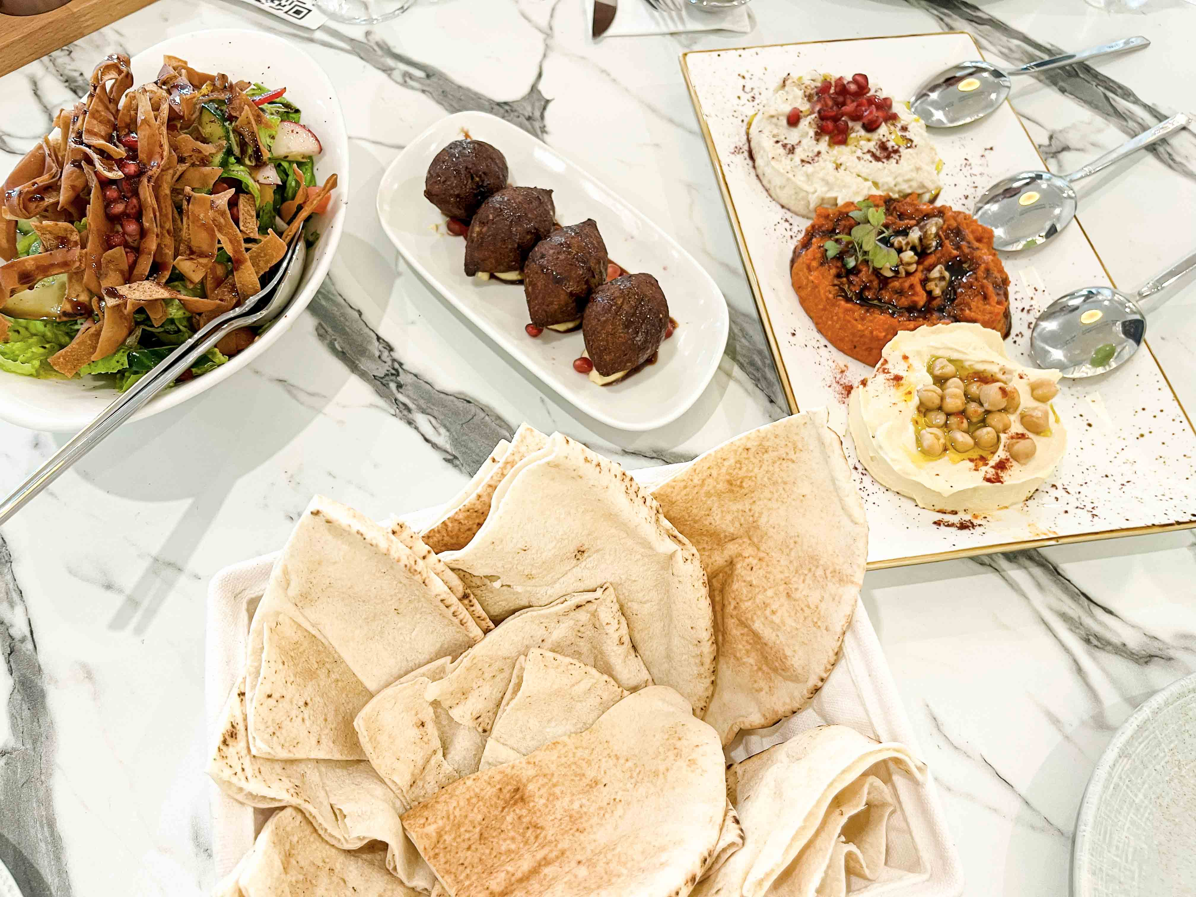 Then the table began to fill with appetizers, each one more inviting than the last. We started with a classic fattoush salad – a medley of crisp greens tossed with tangy sumac and crunchy pita chips – a refreshing opener for the palate. Beside it was golden-brown kibbeh (crispy bulgur shells filled with spiced meat), savory and satisfying. Warm, fluffy house-baked bread arrived next, accompanied by a trio of dips: silky hummus, smoky-sweet muhammara, and creamy matabal, each bringing a distinctive flavour. Every bite of these starters managed to be comforting yet offer something new.