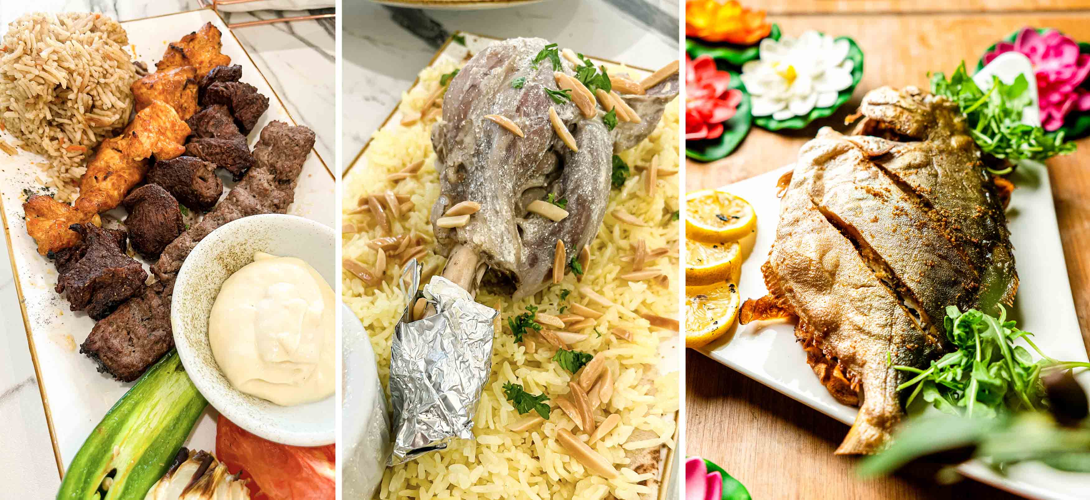 For our mains, a parade of specialties from across the Middle East showcased the chefs’ diverse backgrounds. We savoured delicate grape leaves stuffed with spiced rice and served with tender lamb, a generous Jordanian mansaf featuring slow-cooked lamb over tangy yogurt-sauced rice, and an artfully arranged mixed grill of chicken shish taouk, juicy minced kebab, and marinated beef tenderloin – each grilled to perfection with an ideal kiss of smoke. Every plate arrived like a work of art, yet the presentation never outshone the comforting authenticity of the flavours.