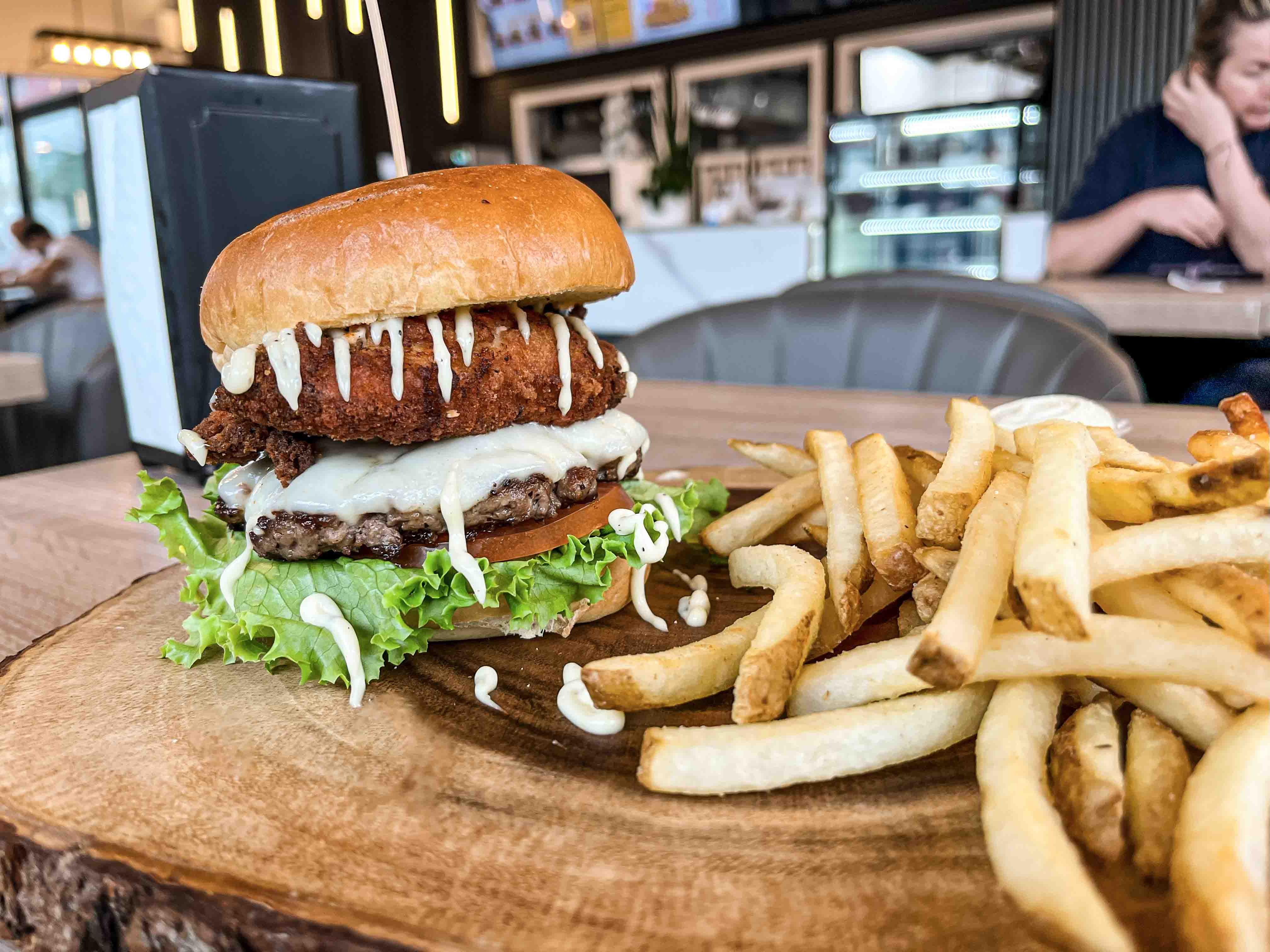 The first burger we tried was the Matador – a stacked masterpiece made with a juicy, fresh beef patty, mozzarella cheese, a crispy fried chicken fillet, lettuce, tomato, and their house-made garlic sauce. The combination of textures and flavours made this one of the most memorable bites of the day. The beef patty was seared beautifully and cooked through, but still moist, with the mozzarella acting as a gooey binder. The fried chicken gave the burger a crunch and richness that made every bite feel indulgent, while the garlic sauce brought a savoury zing that lingered pleasantly.