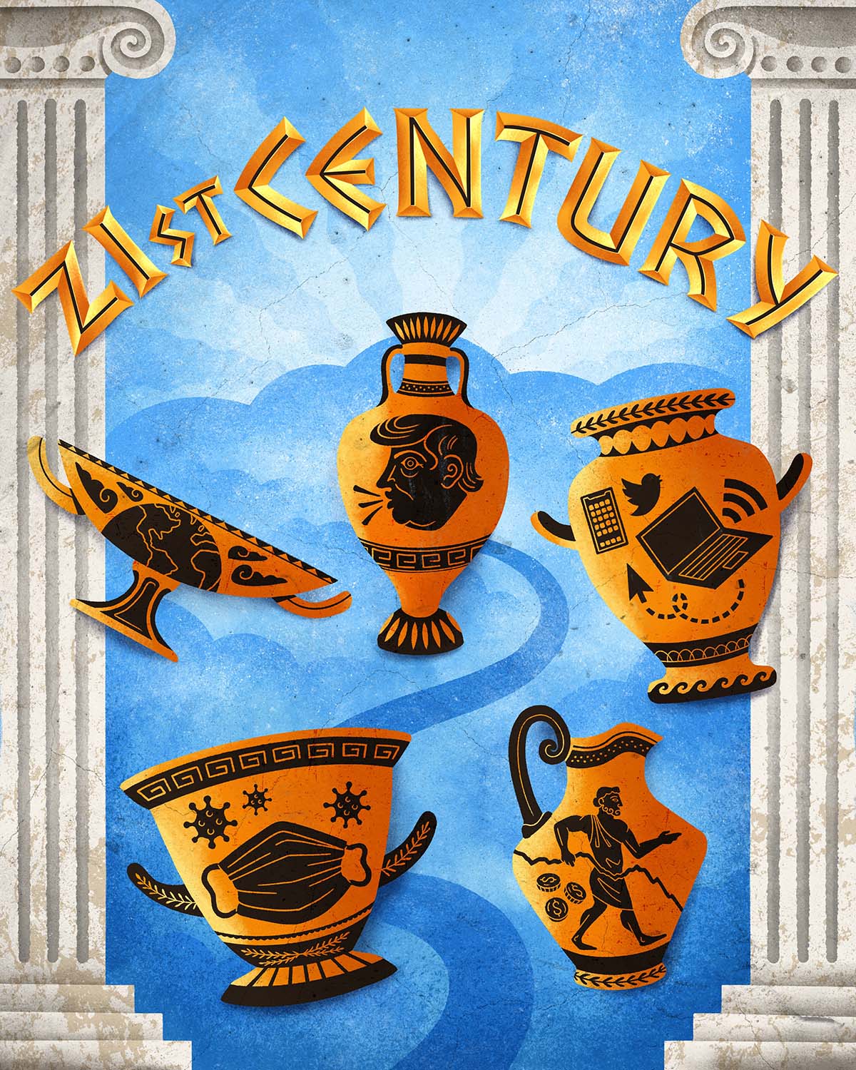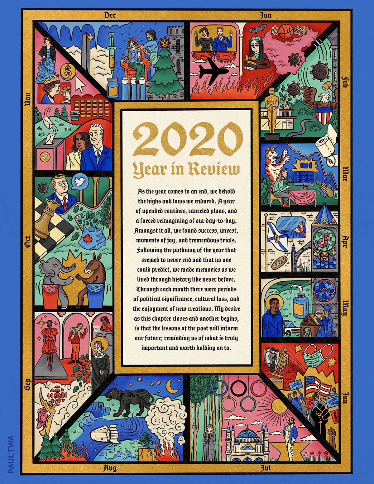In 2020 I began an annual project where I illustrate important events from the year in chronological order around a rectangular calendar. This project was inspired by my grandmother who illustrated the visual pathway of her marriage with important family and news events that she updated every anniversary. I began my version after the pandemic since so many people were saying “it feels like we were living through history like never before” and I wanted to document all the important political, environmental, and pop-cultural events we collectively experienced that year. Each new year I illustrate the calendar in a different style from art history, in this way linking the recent past with the history books. I send the calendar to family and friends in my Christmas card at the end of the year.