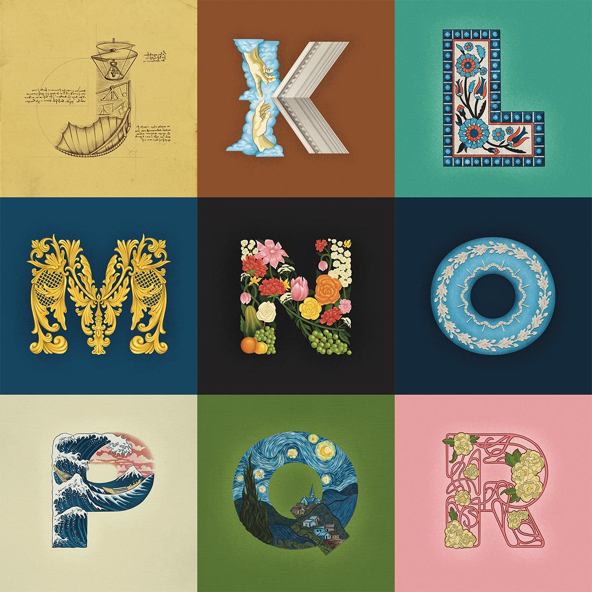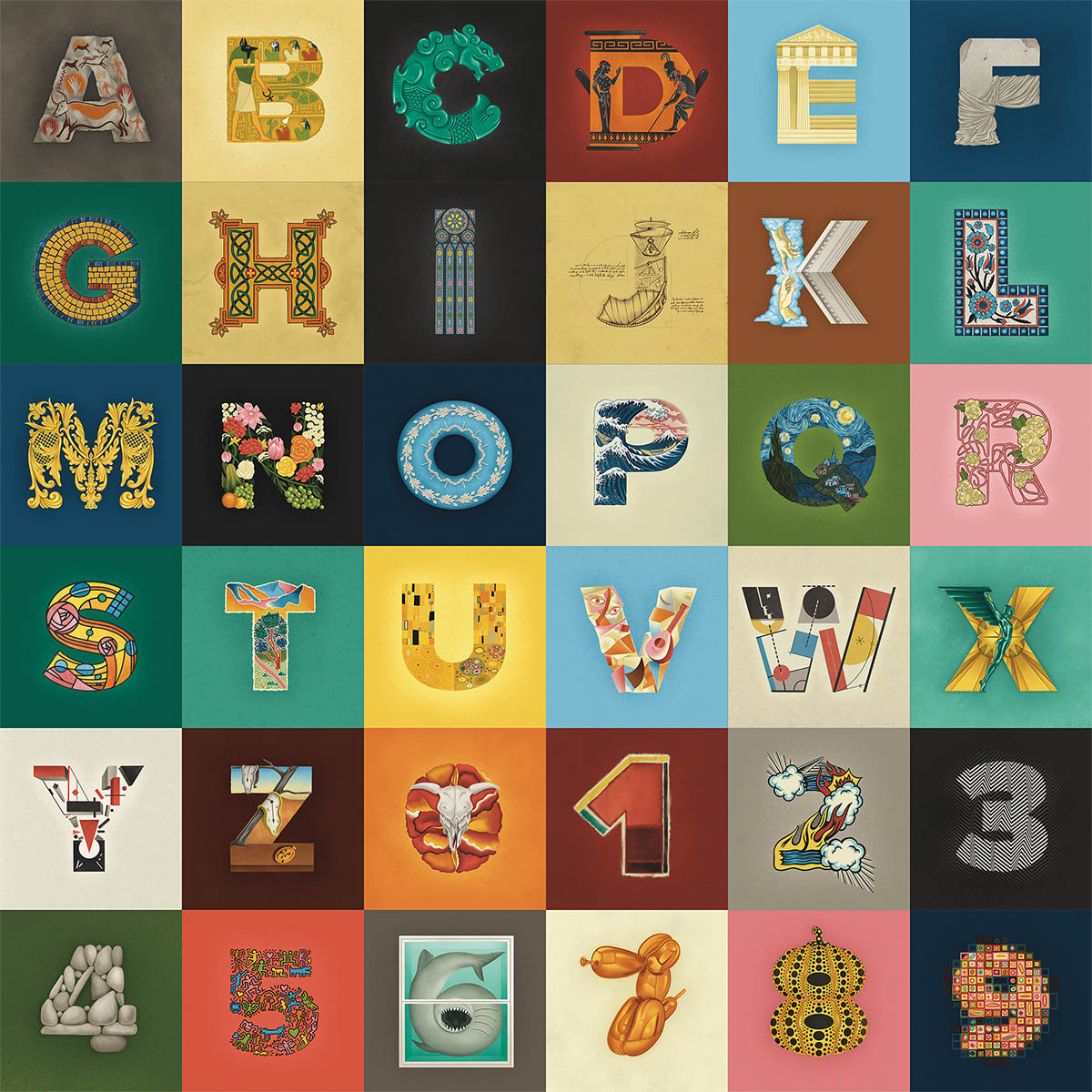 I recently completed an illustrated alphabet that documents art movements and artists from across the centuries in chronological order. So A is drawn like a cave painting from 14,000 BC, F is drawn like a Roman statue from 200 AD, Q is drawn like a Van Gogh impressionist painting, and so on. It was a massive undertaking but a really enjoyed working on it as it perfectly encapsulates my interests.