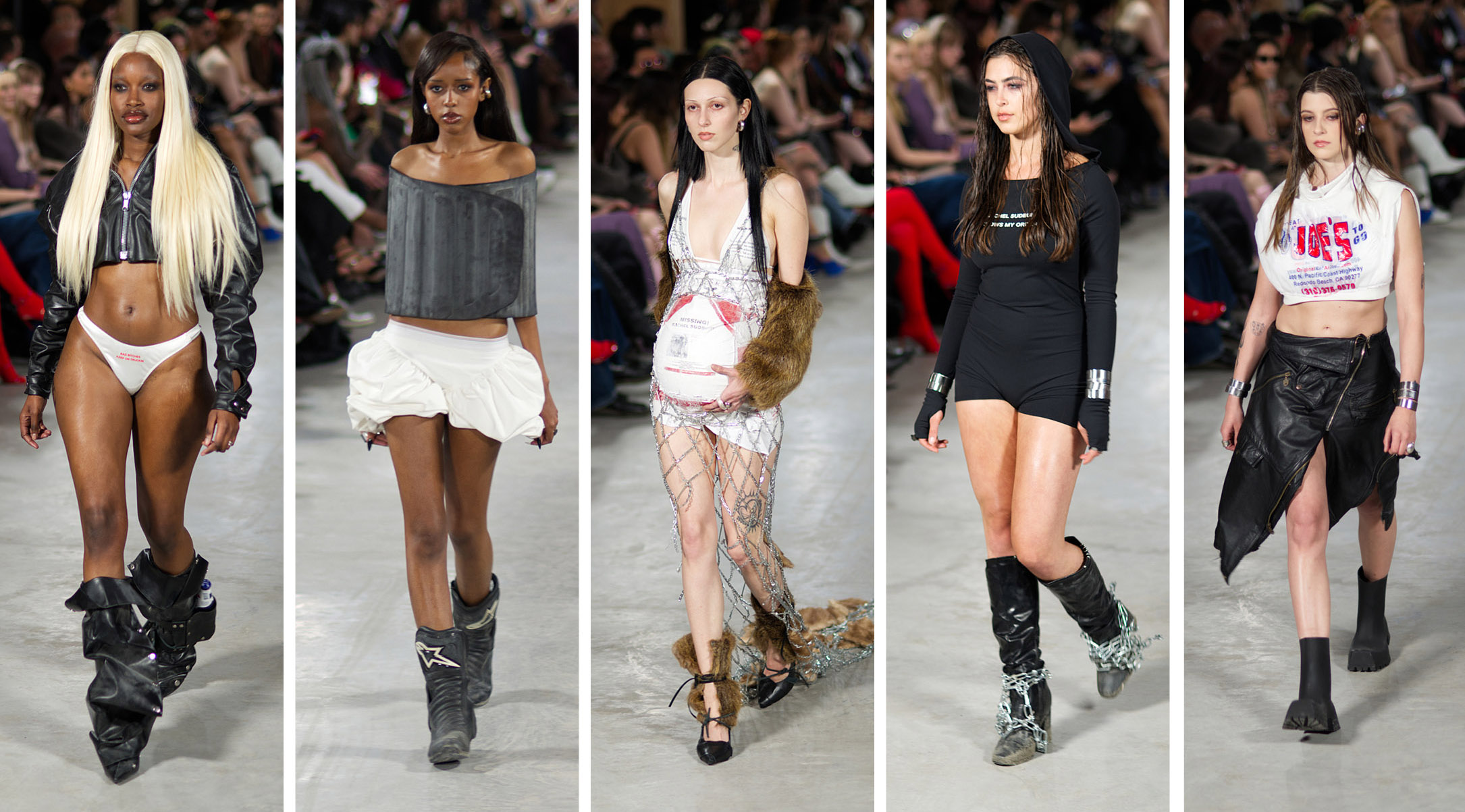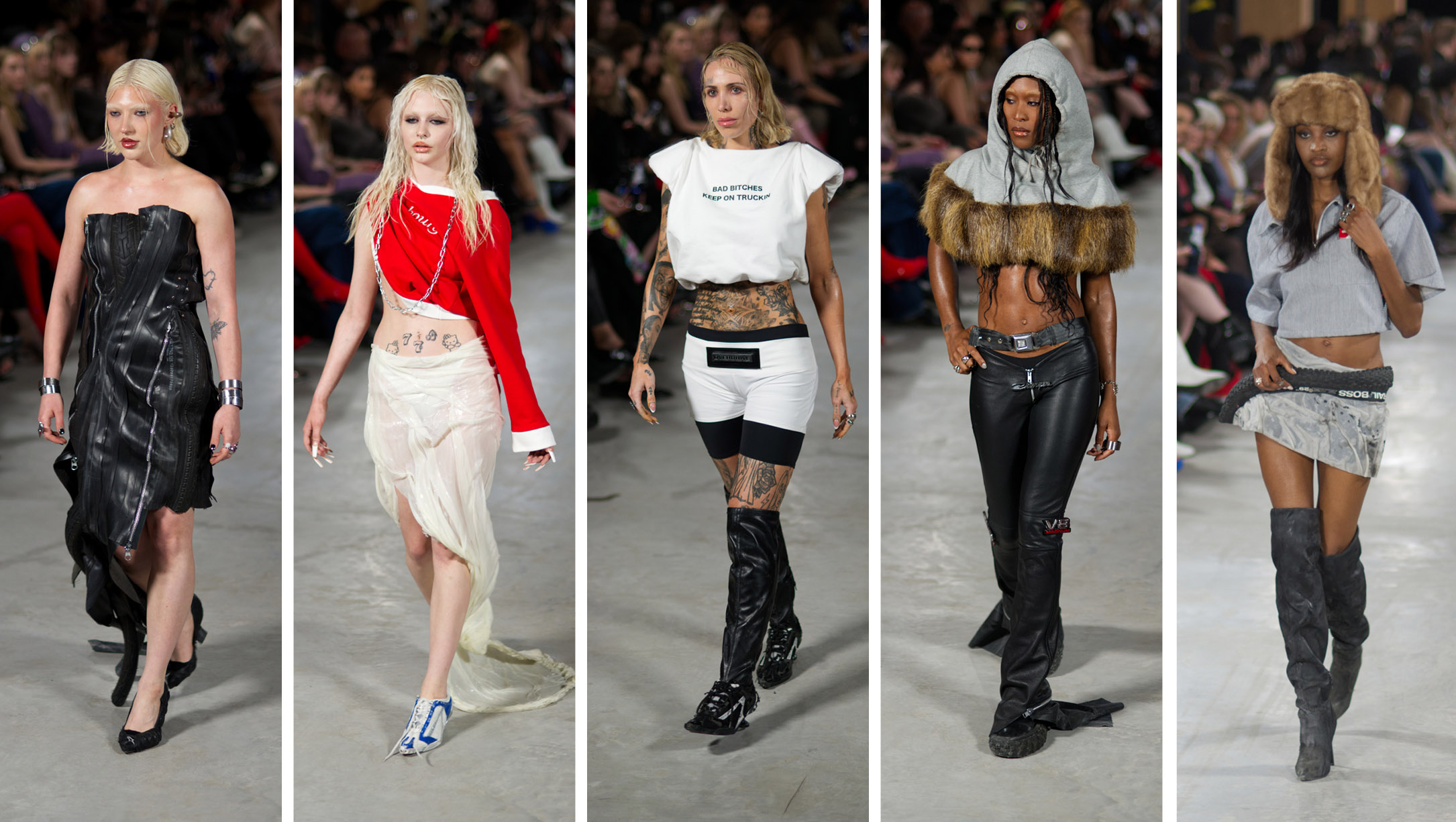 Rachel Sudbury’s designs are known for their unique craftsmanship and attention to detail. She combines different textiles and carefully chosen materials to create sustainable garments with multiple textures. The combination of materials allows her to play with a wide range of colors and textures in her designs. For her latest collection featured on the Fashion Art Toronto runway, Rachel Sudbury incorporated unconventional materials such as bicycle tires, faux fur, plastics, metal chains, retro car seat belts, and emblems.